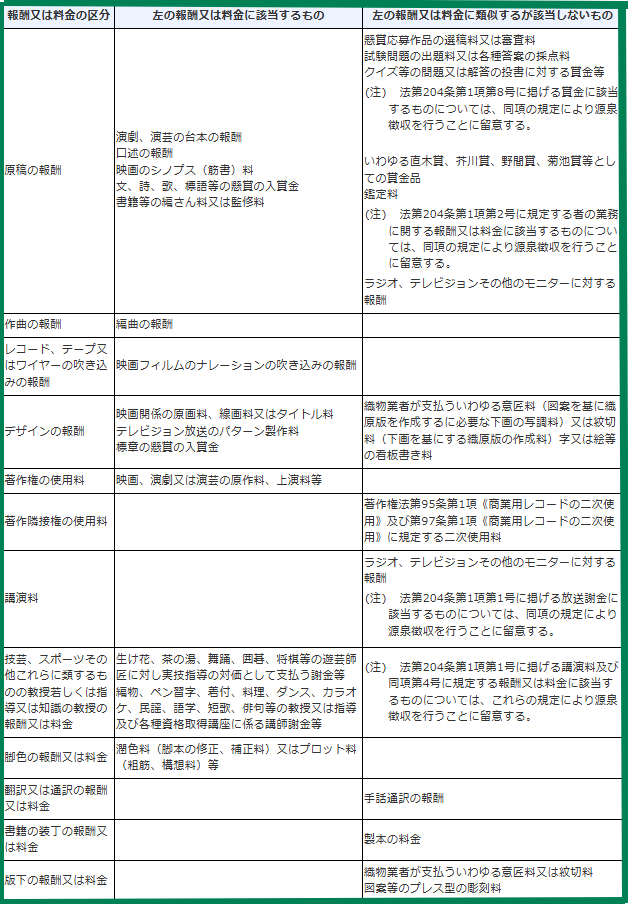 国税庁上、源泉徴収が必要な支払報酬は、所得税法204条1項に限定列挙されており、全部で8項目あります