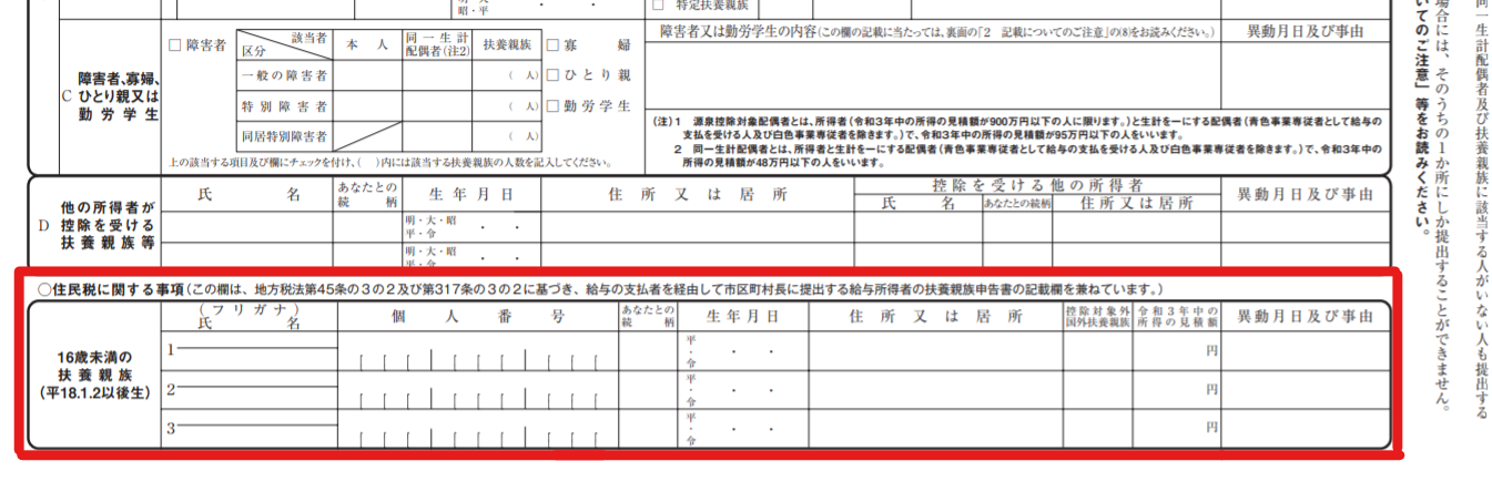 この「扶養控除等申告書」の一番下に「住民税に関する事項 16歳未満の扶養親族」という欄があります。